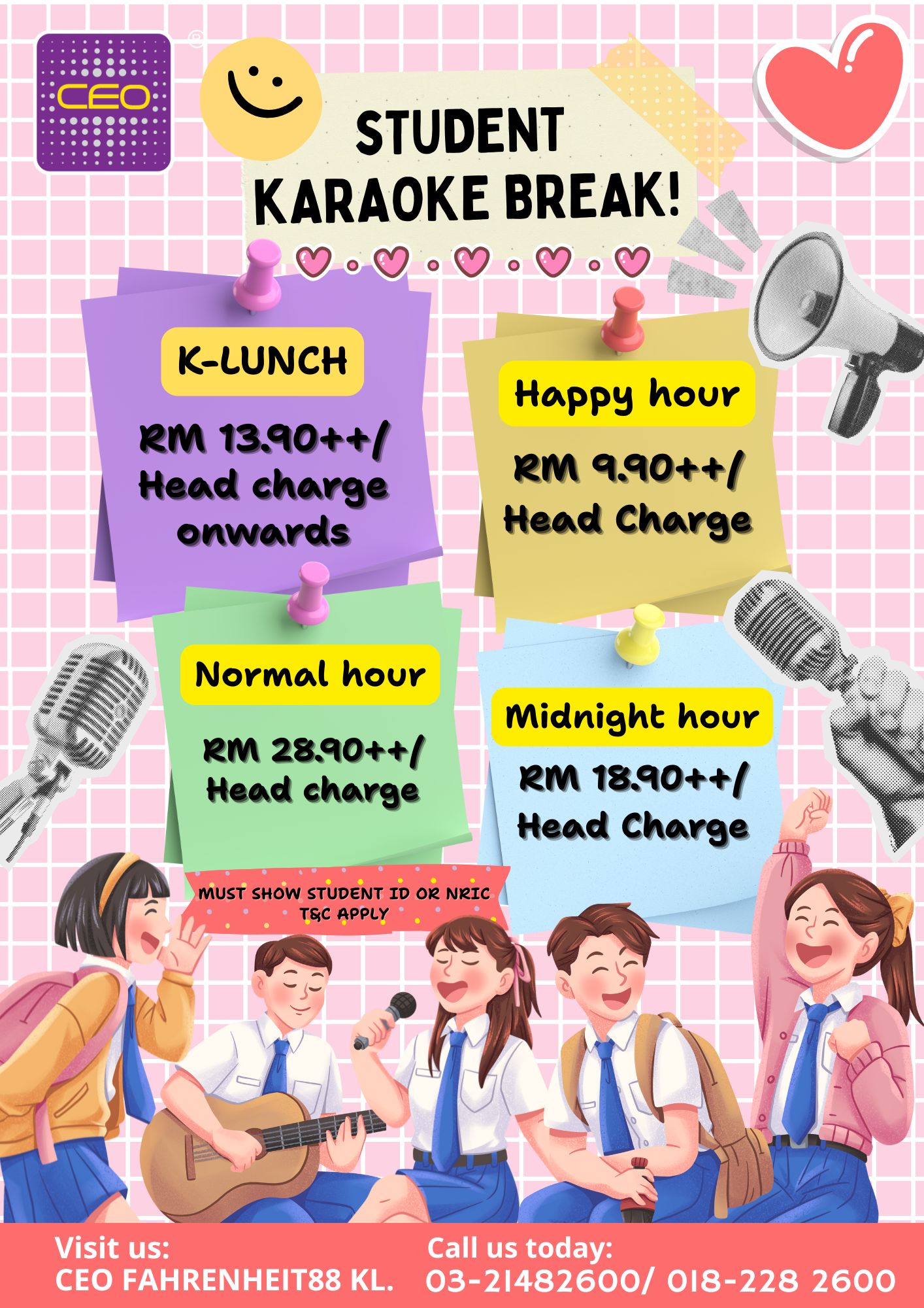 Selamat datang ke CEO dipersembahkan oleh Neway Karaoke Box, destinasi utama anda untuk hiburan karaoke. Bernyanyi, menari, dan cipta kenangan yang berharga dengan pilihan lagu yang luas dan suasana yang mengundang. Sertai kami untuk pengalaman yang tidak terlupakan di bilik karaoke kami. Biarlah muzik menyala jiwa anda di Neway Karaoke Box Malaysia.