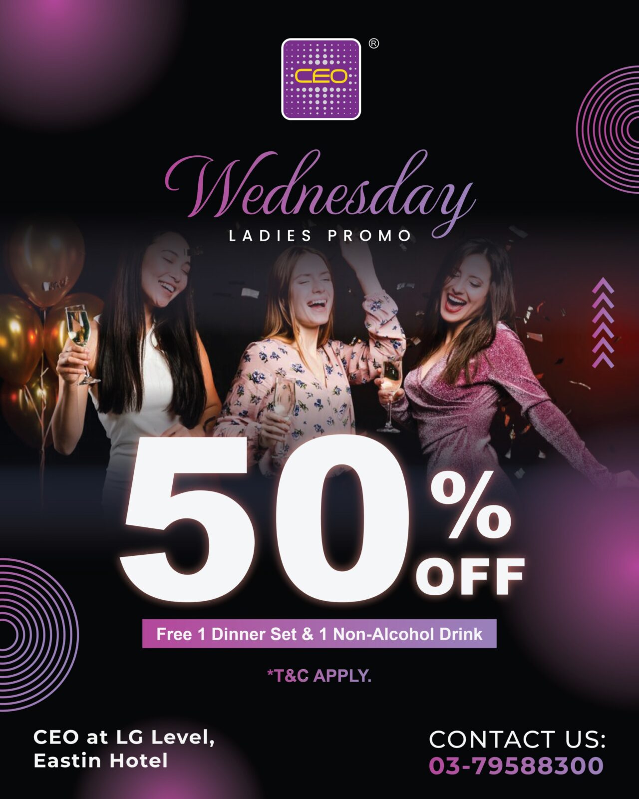 CEO EASTIN – EVERY WEDNESDAY LADIES NIGHT 50% OFF.